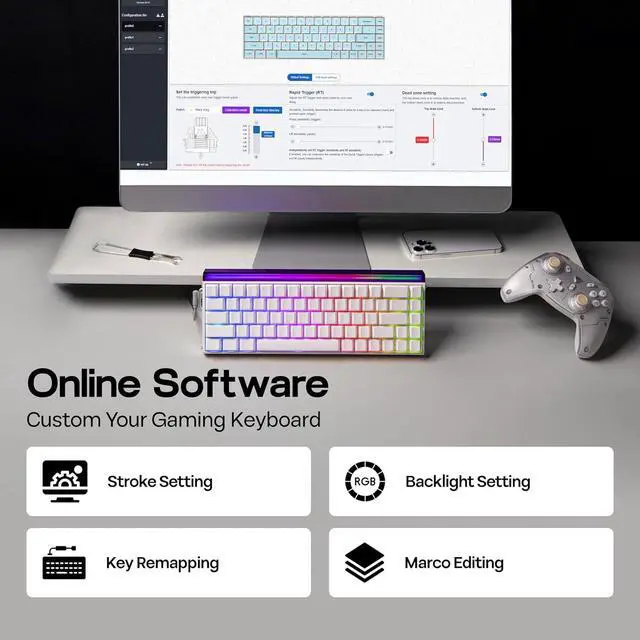 Programmable Web Driver Tailor your Hero68 HE gaming keyboard through the provided web driver. Reachable from any location via a Chromium-based browser, this feature lets you adjust key mappings, set up macros and hotkeys, change lighting patterns, and adjust the actuation point. By implementing Mod Tap or Dynamic Keystroke, you can assign several functions to one key, allowing for command activation based on taps, holds, or varying keystroke distances while maintaining control of movement keys.