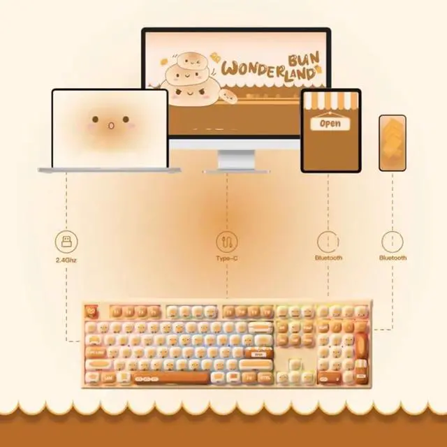 MG108B Mechanical Keyboard:MG108B Bun is a mechanical keyboard that combines whimsical design with advanced functionality. It features customizable RGB backlighting, hot-swappable sockets, and multi-mode connectivity options, making it ideal for both gamers and typists who appreciate style and versatility.