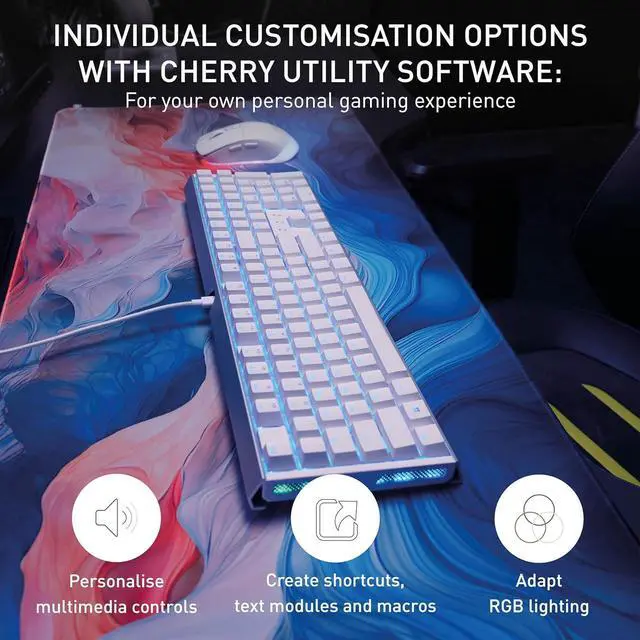 CUSTOMIZABLE RGB ILLUMINATION. The MX 3.1 offers 16.8 million color LED illumination, customizable via CHERRY software. Choose from integrated color schemes or create your own effects. Personalize multimedia controls, shortcuts, text modules, and macros with the software.