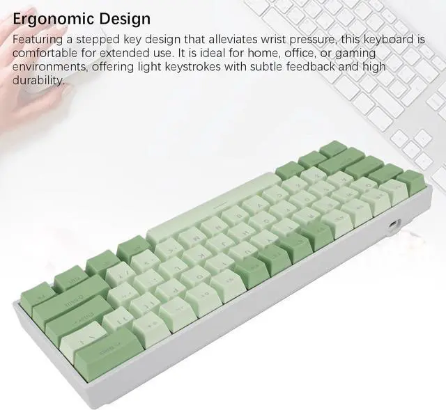 Ergonomic DesignThe design of this mechanical gaming keyboard is based on ergonomics. Featuring a stepped key design that alleviates wrist pressure, this keyboard is comfortable for extended use. It is ideal for home, office, or gaming environments, offering light keystrokes with subtle feedback and high durability.