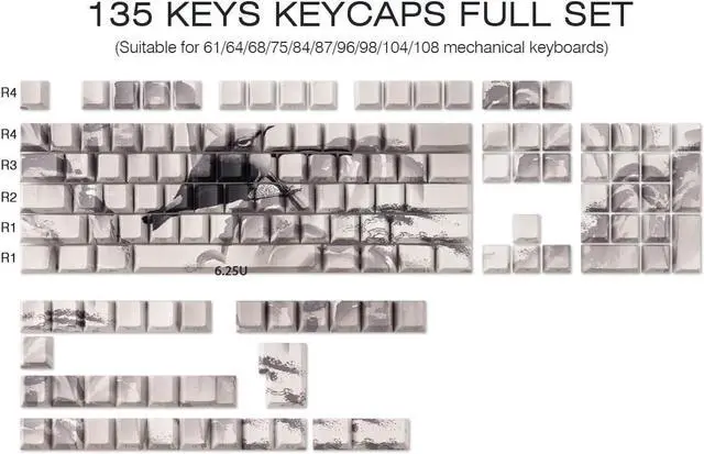 Keycap Set:This keycap set includes 135 keys with a 6.25u spacebar and 1 keycap puller, fit most 60%/65%/75%/80%/96%/100% (61/64/68/75/84/87/96/104/108) US layout mechanical keyboard