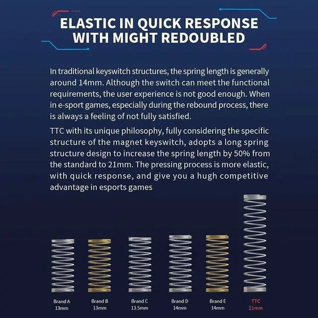 ELASTIC IN QUICK RESPONSE WITH MIGHT REDOUBLED TTC: with its unique philosophy, fully considering the specific structure increase the spring length by 50%from the standard to 21mm. The pressing process is more elastic, with quick response, and give you a Hugh competitive advantage in esports games.