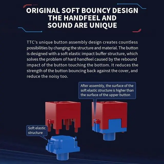 ORIGINAL SOFT BOUNCY DESIGN: The button is designed with a soft elastic impact buffer structure, which solves the problem of hard hand feel caused by the rebound impact of the button touching the bottom. Reduces the strength of the button bouncing back against the cover, and the noise too.