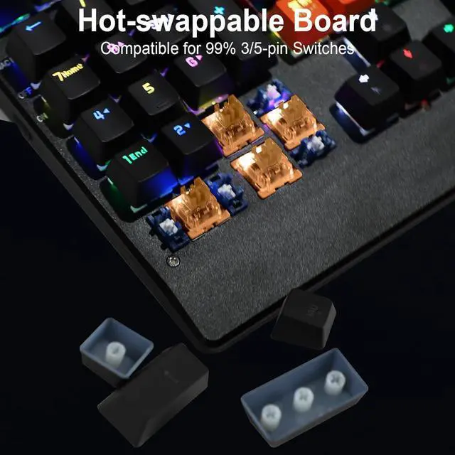 Hot Swappable Red Switches: this keyboard is equipped with hot swappable PCB to ensure easy replacement or change of switches. You dont need to solder it. Red Switch requires less force to press down and the keys feel smoother and easier to use. It's best for work and mmo, imo games