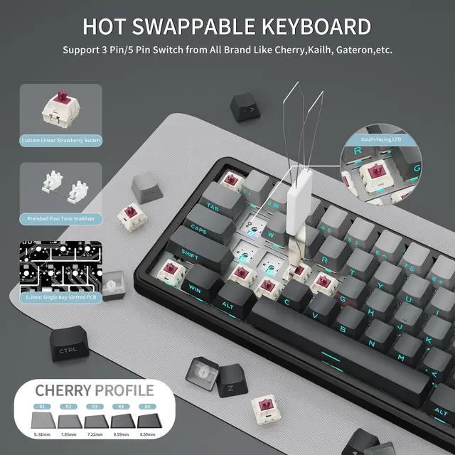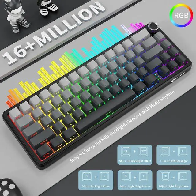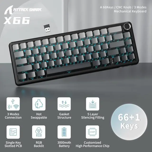 1Smart Indicator Light2Adjustable Foot StandThe video showcases the product in use. The video guides you through product setup. The video compares multiple products. The video shows the product being unpacked. Merchant videoCustom Linear Switch Easy to Check Battery ATTACK SHARK X66 Tri Mode Mechanical Gaming Keyboard hero-video