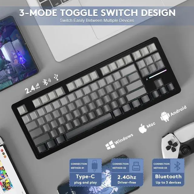 Tri-Mode Connection Mechanical KeyboardATTACK SHARK M87PRO V2 wireless keyboard support multi device connection by USB C wired, 2.4Ghz wireless and Bluetooth 5.0, allowing seamless switching among up to 5 device, make work, study and gaming more efficient and flexible, equipped with 5000mAh large capacity battery, ensure a long term endurance for one charge, support Win/Mac switchable, consider all your needs when using