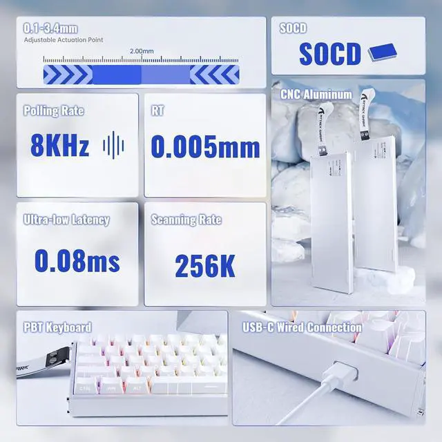 High Performance Magnetic Keyboard with Ultimate ControlATTACK SHARK X68 MAX HE:Dominate with Zero-Latency Precision.Powered by a custom ultra-fast gaming chip,it delivers 8000Hz polling rate,0.08ms ultra-low latency,and 256K scan ratecapturing every keystroke instantly.Experience true real-time response:react without prediction in intense games like Valorant,Osu,Apex Legends,and CS2.Gain absolute control for smoother,more intuitive gameplay that wins