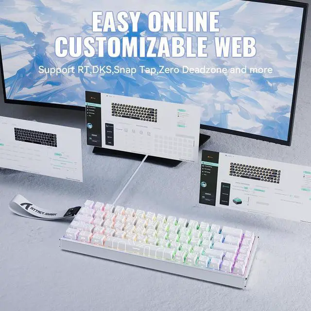 Hall Effect Keyboard with Adjustable ActuationElevate your gaming setup.Equipped with custom magnetic switch,the ATTACK SHARK X68MAX HE deliver 0.005mm actuation accuracy and full DIY adjustability for lightning-fast,personalized response,offer pure HIFI acoustic feedback and tournament-ready tactile feel,multi-layer silencing foam + aluminum plate eliminates ping and stabilizes keys for consistently clean,crisp soundeven magnetic switches can sound sublime