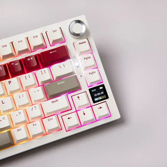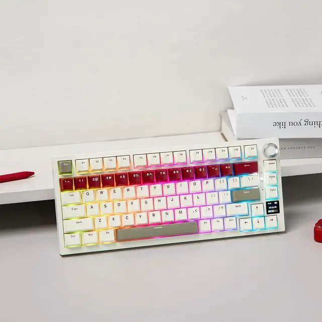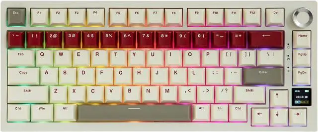 75% Compact Design & TFT Screen Created with both gaming enthusiasts and professionals in mind, the Ajazz AK820 Pro keyboard combines innovative features with skilled craftsmanship. This compact 75% mechanical keyboard effectively utilizes your desk space and offers a modern aesthetic. It includes an 0.85 inch TFT Screen that serves as an interactive hub for instant updates and user modifications. The high-resolution display supports a variety of customizable elements like visuals, battery levels, date and time, connection statuses, and backlighting options.