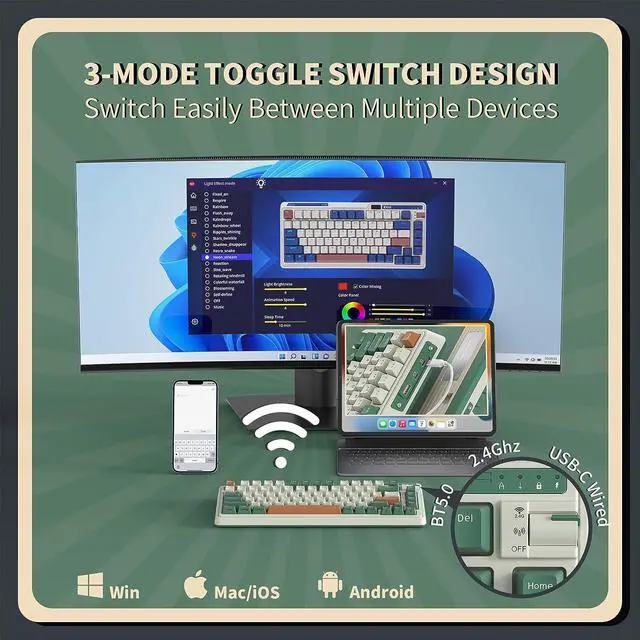 3 Modes Connection - This wireless mechanical keyboard supports tri-mode connectivity, USB Type-C wired mode, stable 2.4GHz and low-latency BT 5.0 wireless modes, which can be easily toggled with the sensitive knob.