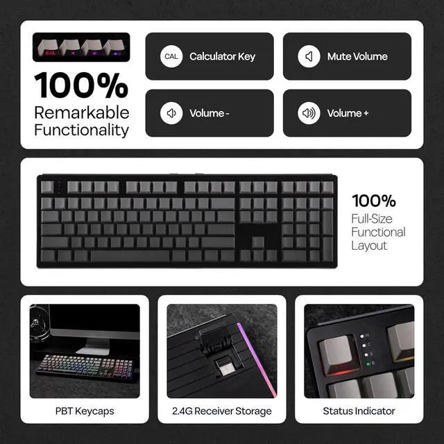 100% Layout, 100% Impressive Capabilities Transform your gaming and work environment with the TH108 full-sized gaming keyboard, built for intense gaming and demanding professional tasks. With 108 durable double-shot PBT keycaps that stand the test of time and a solid plastic design weighing over 1.2kg, this mechanical keyboard ensures stable typing. The superior build doesn't stop at aesthetics; featuring a powerful 8000mAh battery and thoroughly tested gaming chips, the TH108 delivers a 2ms ultra-low latency in wired mode and a 1k polling rate through its handy 2.4GHz wireless option, enabling precise and reliable execution during intricate gaming moves.