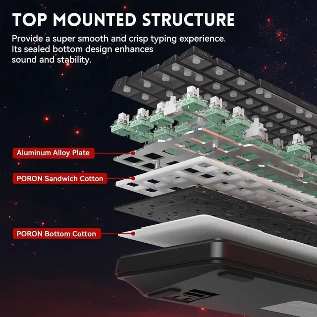 South-facing LEDs Top Mounted StructureSouth-facing RGB LEDs eliminate glare while casting 16.8 million colors through dual-shot PBT keycaps - perfect for dimly lit COD sessions without distracting screen reflections. use top-mount structure with aluminum alloy plate and three layer filling(PORON foam+EPDM foam+Silicone) and fine tuned precision-stabilized switches to offer a quiet, stable and smooth typing operation, ensure a smoother typing experience with less wobbliness,withstands 50M keystroke durability tests.