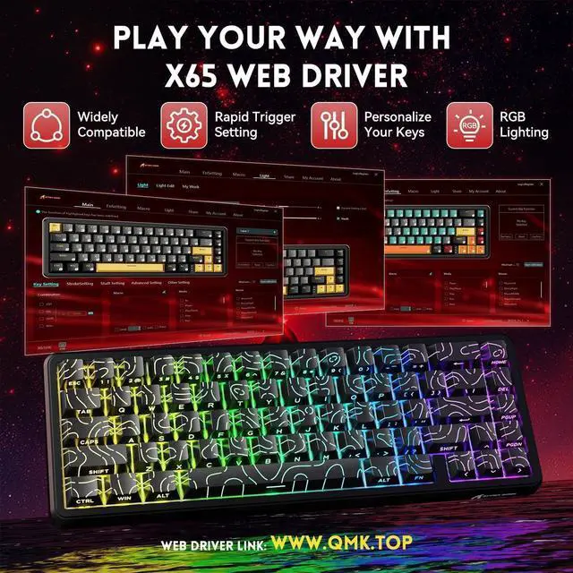60% Hot-swappable NKRO Keyboard ErgonomicsThe X65HE compact design with 67 keys in a 60% ANSI US layout, save more space for your desk. Adjustable feet offer 3-angle ergonomic support, reducing wrist strain during marathon sessions. Built for gamers who demand both precision and comfort. Hot-swappable design lets you customize switches effortlessly, adapting to your preferred typing or gaming style. The hot-swappable PCB allows users to switch between different north-pole-down magnetic switches. FN key combination function, and seamless dual-system Win/Mac switchable.