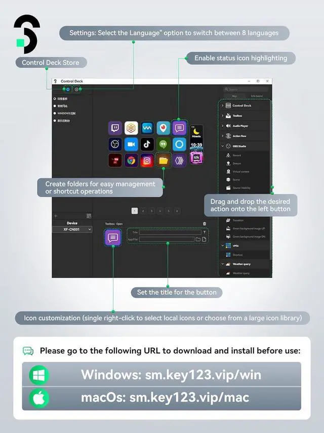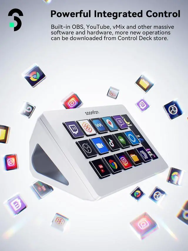 Intelligent design and user-friendlyThe SOOMFON Studio Control Deck comes with a removable stand that allows you to customize it to your needs. You can lay it flat on the stand and connect it to your computer via USB. The bottom of the Stream Controller has rubber feet so that it won't slide around on your desktop, even when you're not using the stand.
