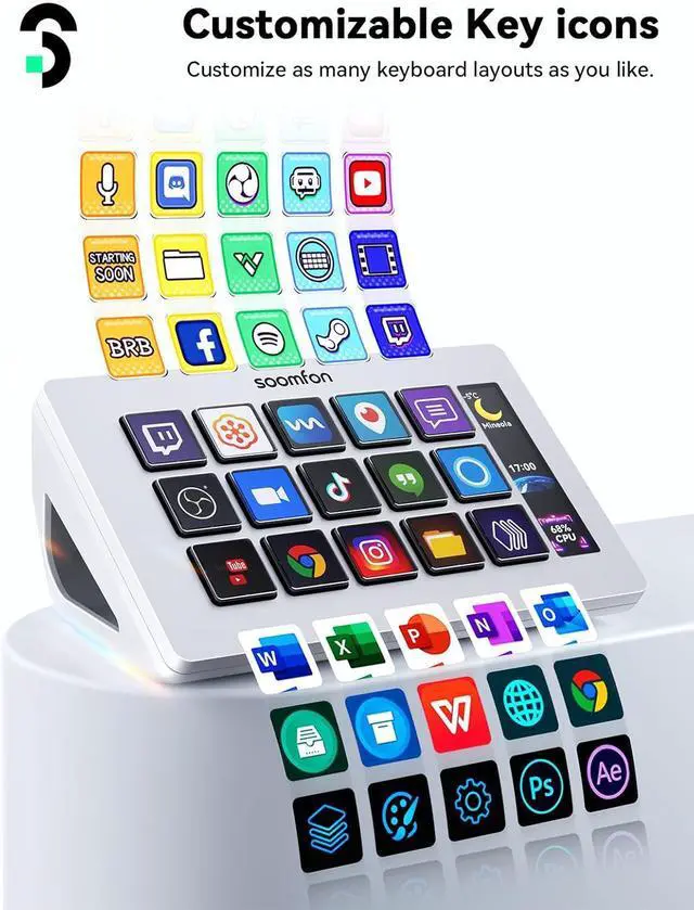 15 Customizable LCD keysTrigger unlimited actions with 15 Customizable LCD Keys to control your apps, tools and platforms effortlessly without having to move windows to access what you want. The buttons include LCD screens that you can customize with your own preferred image files. The side dashboard displays instant information like computer CPU, memory, etc. Make your live streaming, video editing, music production and more visible and controllable.