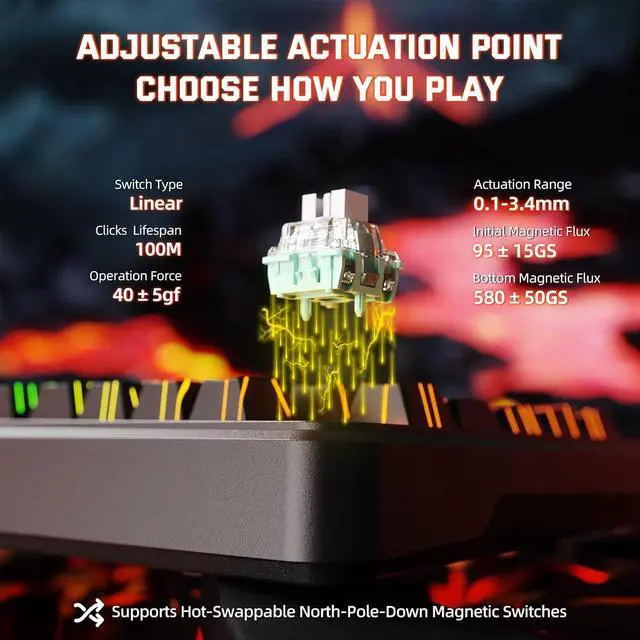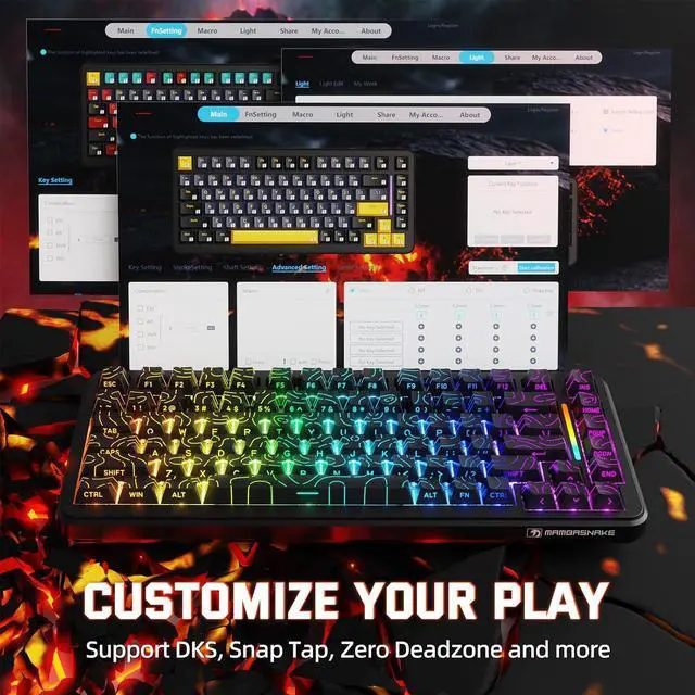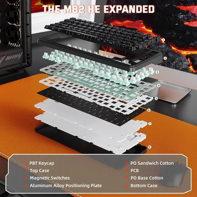 0.01 mm RT Sensitivity & Zero Dead ZoneMAMBASNAKE M82 HEs Hall-effect magnetic switches trigger at just 0.01 mm travelwith zero dead zoneso every keystroke registers the instant you press, delivering pro-level responsiveness for FPS, MMOs or rapid typing.
