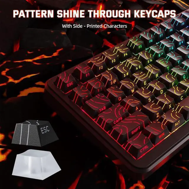 Side-Printed, Pattern Shine Through KeycapsCrafted from PBT with side-printed legends, these keycaps feature a subtle electromagnetic-wave pattern that lets backlight glow throughcombining minimalist aesthetics with durable, fade-resistant legends.
