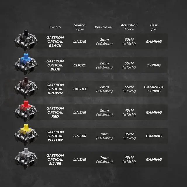 • Gateron Optical Switches Gateron optical switches can be hotswapped at wish and replaced by other switches. Hot swap keyboard do not recquire you to solder / desolder switches. (Hot Swappable with Optical switches only)