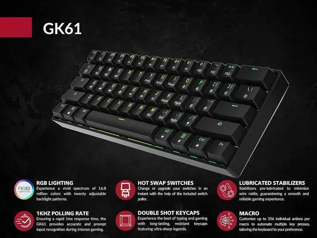 • ABS Doubleshot keycapsThe GK 61 doubleshot abs stock keycaps , change them at wishes thanks to the keypuller included to the package.