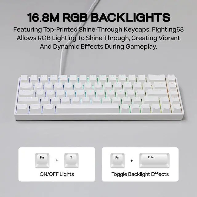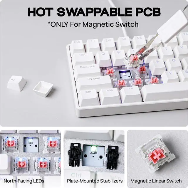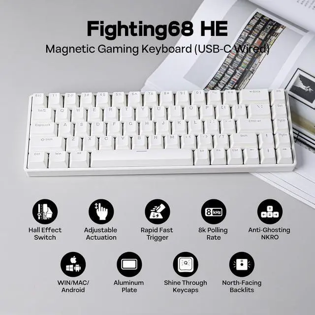 Customize Your Experience The hot-swappable magnetic switches allow you to easily replace switches to tailor your typing or gaming feel. Whether you prefer a lighter touch for rapid keystrokes or a more tactile response, the Fighting68 custom keyboard adapts to your preferences effortlessly. Combined with OEM-profile keycaps and a detachable type-C cable, this keyboard offers unparalleled customization for every user.