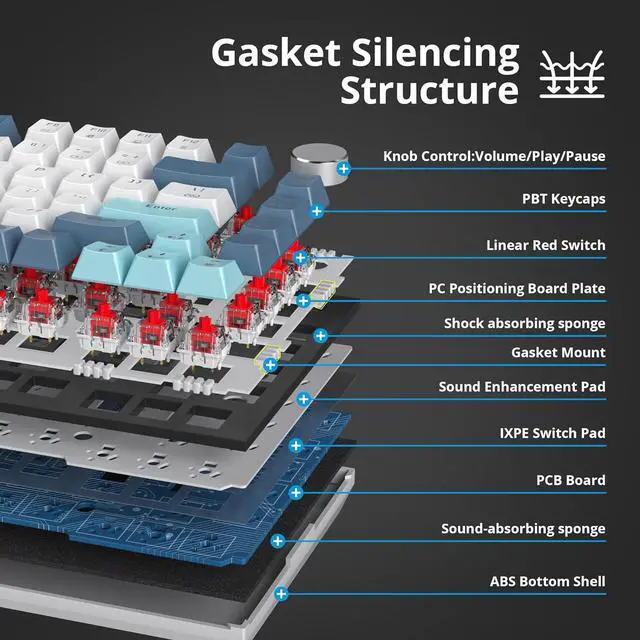 Gasket-Mounted Keyboard: Ussixchare 75% creamy sounding keyboard is engineered with a state-of-the-art gasket structure, featuring four-layer padding. This innovative design, including two layers of sponge, IXPE switch pad, and PET sound enhancement pads, effectively minimizes typing noise while ensuring consistent acoustics with every keystroke, minimizing cavity sound. Say goodbye to distracting clatter and hello to a more tranquil typing experience.
