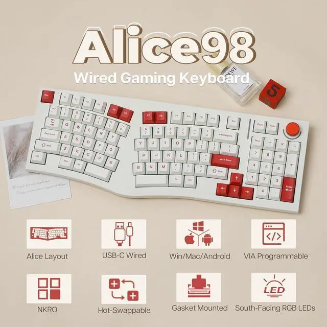 Cherry Profile Dye Sublimation PBT Keycaps The Alice98 Keyboard comes with 5 Sides Dye Sublimation PBT keycaps in Cherry profile, known for their fine texture and clear legends. PBT material is more durable and wear-resistant compared to ABS, preventing the keycaps from becoming oily and ensuring a comfortable typing experience.