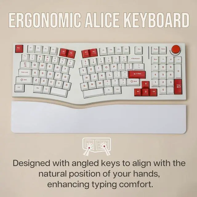 Ergo Alice Layout with a Numpad The Feker Alice98 VIA Keyboard combines the beloved ergonomic Alice layout with the added functionality of a numpad, making it perfect for users who need both comfort and versatility. The Alice layout is designed with angled keys to align with the natural position of your hands, enhancing typing comfort. The split spacebar accommodates this ergonomic design, while a media control knob adds extra convenience. This layout allows your hands to rest naturally, reducing strain during extended typing sessions, all while maintaining the full functionality of a traditional keyboard.