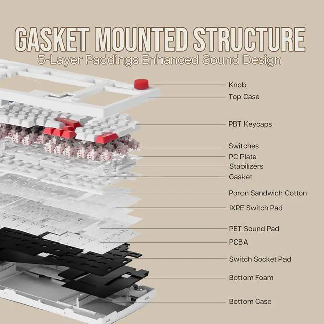 Gasket Mount, PC Plate & Enhanced Sound Design Designed for a superior typing experience, the Feker Alice98 mechanical keyboard features a gasket mount structure with a PC plate, offering a soft, consistent typing feel across the entire keyboard. To further enhance the typing experience, the keyboard includes sound-improving materials such as Poron sandwich foam, an IXPE switch pad, PET film, EPDM socket foam, and case foam. These layers work together to minimize noise and provide a rich, satisfying typing sound, making every keystroke a pleasure.