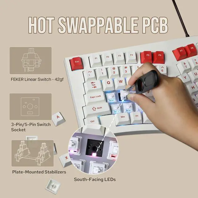 South-Facing RGB Backlight & Hotswappable PCB The Feker Alice98 keyboard is equipped with south-facing RGB LEDs, providing 21 customizable lighting effects that light up your desktop. The hotswappable PCB allows you to easily swap out switches without soldering, providing endless customization possibilities. The keyboard is also fitted with lubed plate-mounted stabilizers, making it easy to modify for a personalized typing experience. Additionally, the keyboard supports NKRO, ensuring that every keypress is registered, even during fast typing.