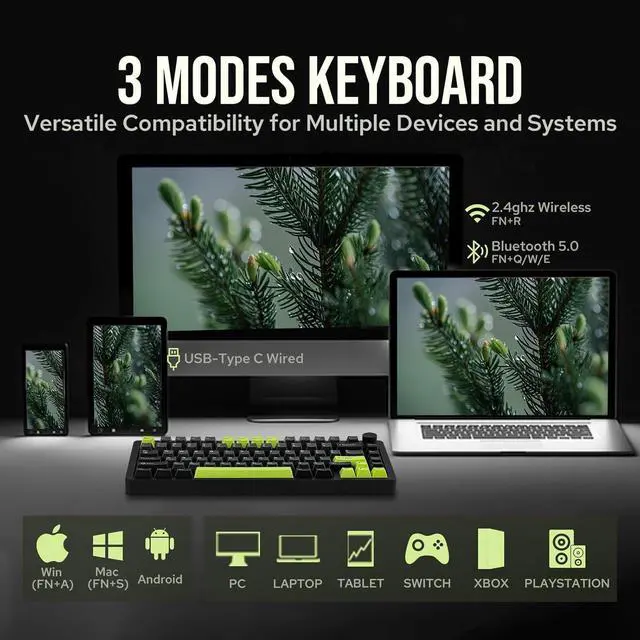 Seamless Tri-Mode Connectivity with 4000mAh Battery The Blade75 wireless gaming keyboard is built for versatility with tri-mode connectivity options, including Bluetooth 5.0, 2.4GHz wireless, and Type-C wired connections. Whether youre gaming, working, or just browsing, this wireless keyboard offers effortless connectivity and stability. Thanks to its impressive 4000mAh battery, you can experience longer wireless sessions, significantly decreasing the need for constant recharges and keeping your attention on your work.