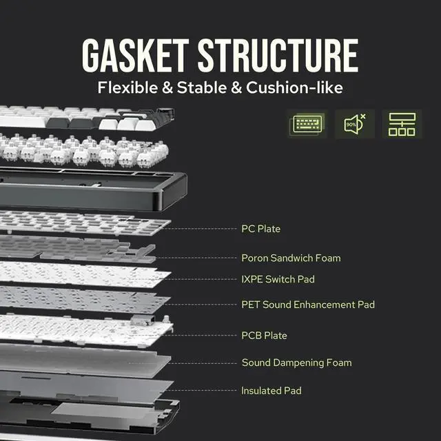 Gasket Mount with Sound Enhancing Materials Enjoy unparalleled typing comfort thanks to the gasket-mounted structure of the Blade75 keyboard. This thoughtful design offers a soft, cushion-like feedback, enhanced by multiple layers of internal padding, including sandwich foam, an IXPE switch pad and PET film. These elements work together to provide a comfortable typing experience and satisfying acoustic quality, ensuring a delightful typing experience with every keystroke.