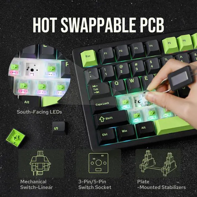 Hot-Swappable PCB with South-Facing RGB Customize your typing experience effortlessly with the Blade75s hotswappable PCB, which allows for easy switch replacements without any soldering required. This hot swappable keyboard is equipped with south-facing RGB backlighting, creating vibrant and adjustable lighting that boosts its visual allure. Moreover, its design supports a variety of keycap profiles, facilitating an enjoyable user experience.