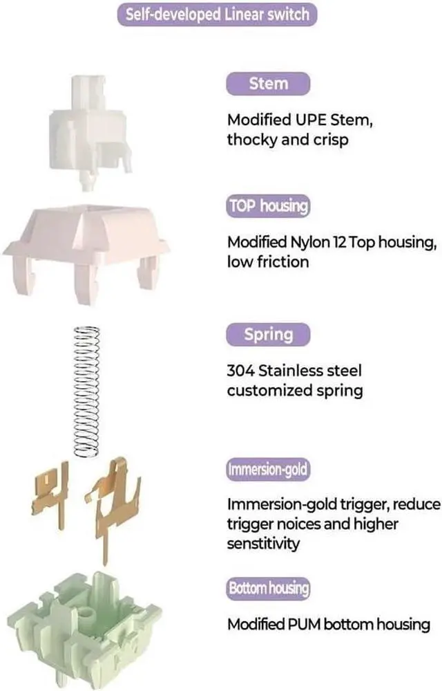 Pre-lubed: Coming factory-lubed and special structured, the switch can also be self-lubed during every key stroke, which is especially helpful for maintaining a smooth feeling. The durable stem is credited to a smoother and pleasing typing experience.