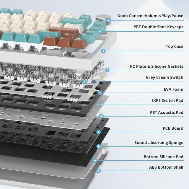 Gasket Mounted & Five-Layer PaddingThis thocky creamy heavy mechanical keyboard features a gasket structure, enjoy superior typing comfort and reduced noise with gasket mounting and five-layer padding. This ergonomic keyboard design enhances stability and provides a creamy keyboard feel.