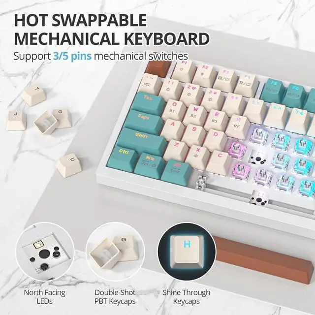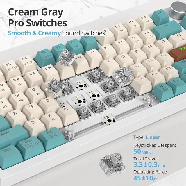Hot-swappable Customization KeyboardThis 75% custom mechanical keyboard supports 3-pin or 5-pin switch replacements, suitable for DIY enthusiasts without needing soldering skills. It comes with pre-lubricated stabilizers and Linear Gray Cream switches for a smooth, responsive typing and gaming experience.