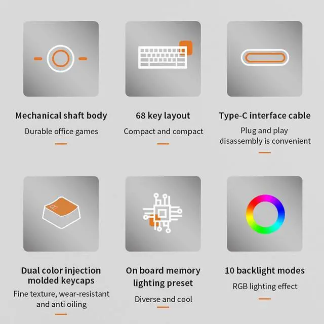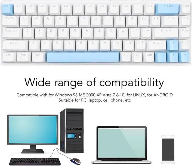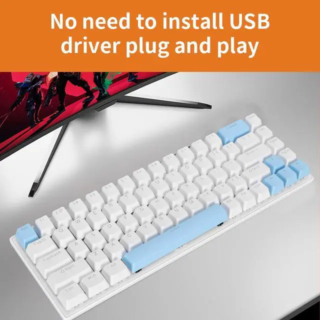[Anti Ghosting] This keyboard's 68 keys respond simultaneously without conflict. Ergonomic hanging ABS injection molded keycaps, use without tiring your hands. Anti fading, sturdy and wearable, characters do not lose color after long term use.