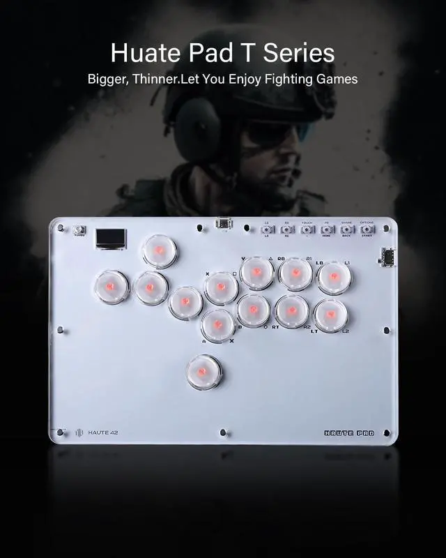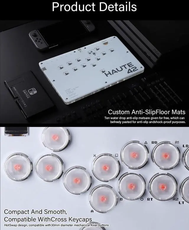 PackageProduct Size: 11.65*7.71*0.49 inches, 2.05lb. Includes 1x T16 Arcade Controller, 1x USB Cable, Accessories (1x Kailh Red low-profile Switch ,1x Switch Puller, 2x 6mm-Button Caps, 6x Anti-Slip Pads), 1x Instruction Manual.