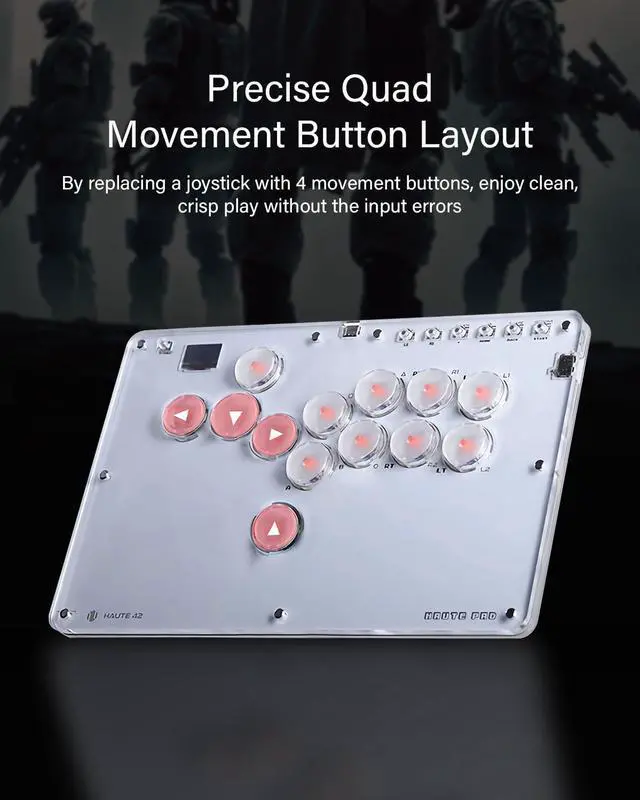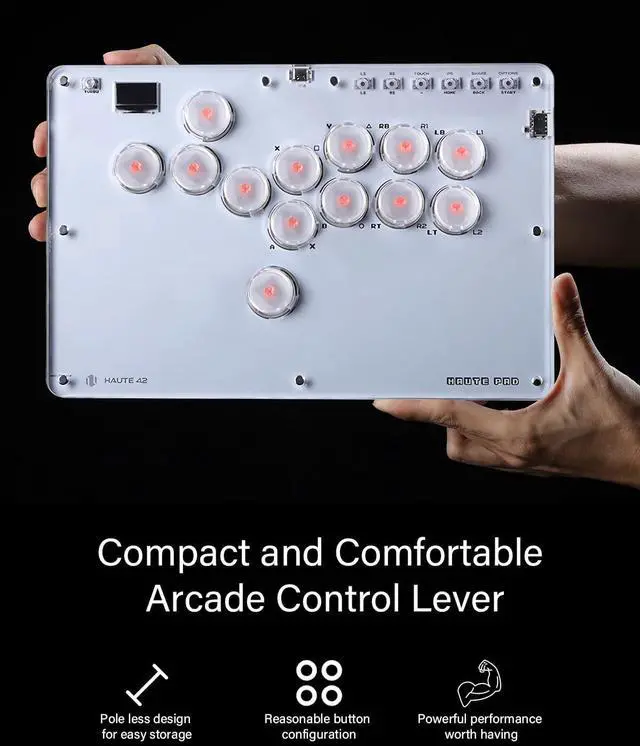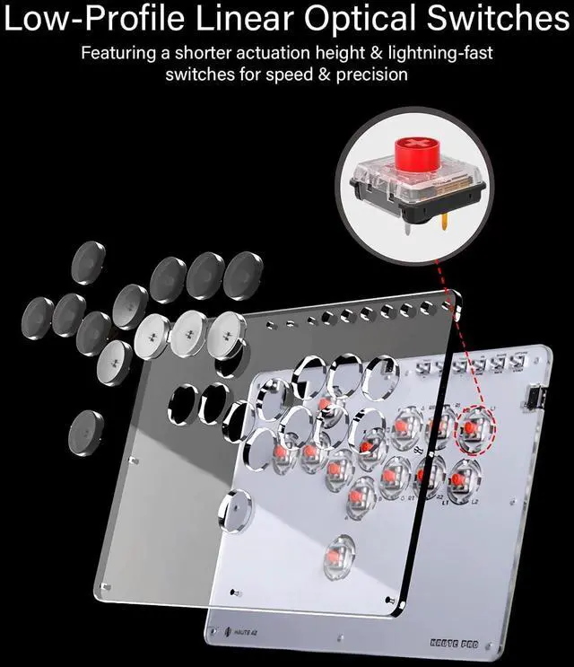 Precise Button Layout & Ultra Low LatencyOur arcade controller adopts precise 4 direction buttons and lightning-fast Kailh Low Profile Switch, it eliminates input errors during gameplay and provides faster and more accurate movements. This all-button arcade stick uses Raspberry Pi RP2024 main control chip manufactured on 40nm process node, low dynamic power consumption, and low leakage,1ms delay, no frame leakage rate above 95%. Supports firmware updates.