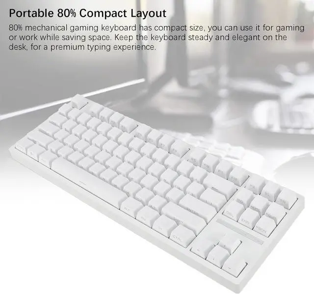 Portable 80% Compact Layout: 80% mechanical gaming keyboard has compact size, you can use it for gaming or work while saving space. Keep the keyboard steady and elegant on the desk, for a premium typing experience.