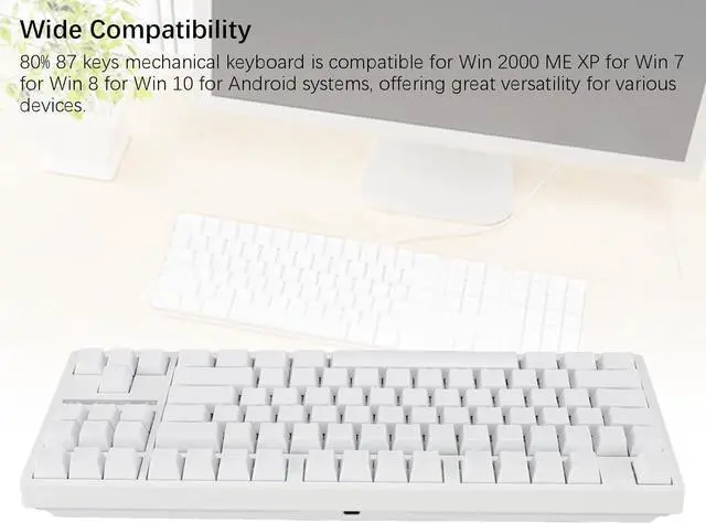 Wide Compatibility: 80% 87 keys mechanical keyboard is compatible for 2000 ME XP for 7 for 8 for 10 for Android systems, offering great versatility for various devices.