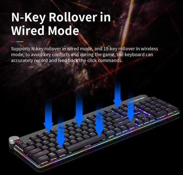 Supports n-key rollover in wired mode, and 9-key rollover in mode, to avoid key conflicts and during the game, the keyboard can curately record and feed back the click commands.