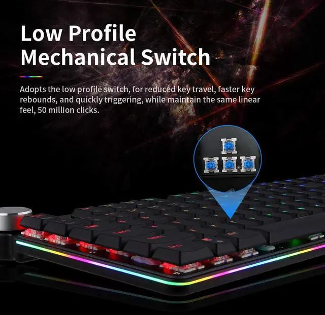 Adopts the low profile switch, r reduced key travel, faster key re , and quickly triggering, while maintain the same linear feel.