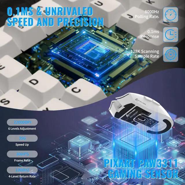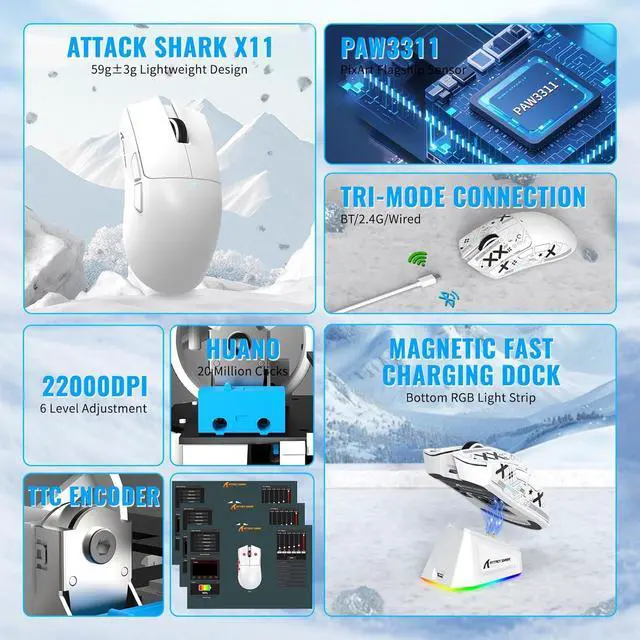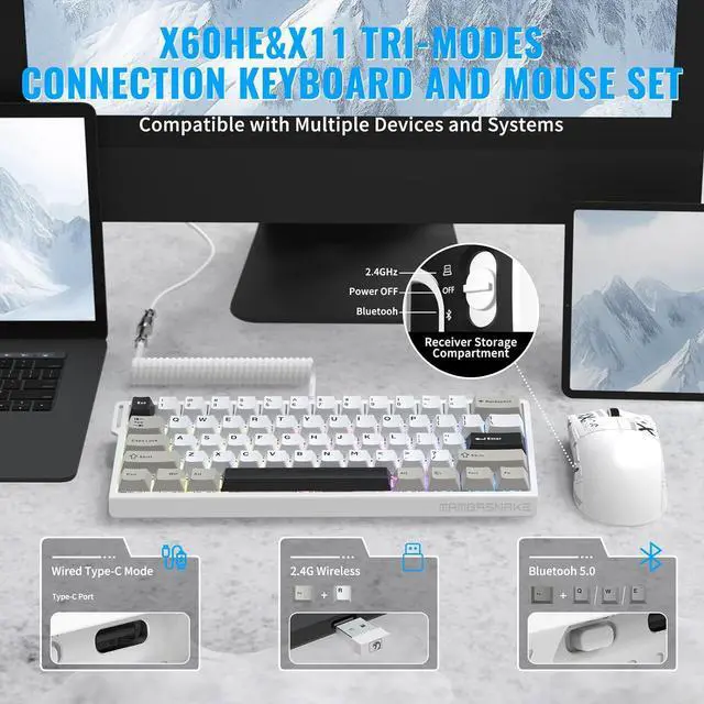 163g Lightweight2PAW33113RGB Lighting4Tri-Mode5Driver Software ModelX60 HE KeyboardNumber of Keys61 KeysConnectivityUSB-C Wired/ 2.4G Wireless/BluetoothRT ACCURACY 0.01 mmPolling RateWired 8000Hz, Wireless 1000HzSampling Rate128KHZHot SwappableYes, compatible with N-pole downward magnetic switchWeb Driverqmk. top (Enter this URL in your browser) Model X11 Lightweight MouseSensor ModelPixArt PAW 3311Weights59gConnectivityUSB-C Wired/ 2.4G Wireless/BluetoothDPI800/1600/2400/3200/5000/22000Polling Rate125/250/500/1000 HzButton 5 Programmable ButtonsWeb Driverbitl. to/4IGu 11 PRODUCT PARAMETER