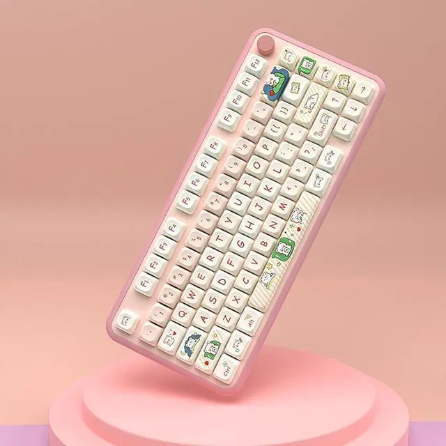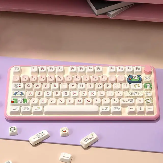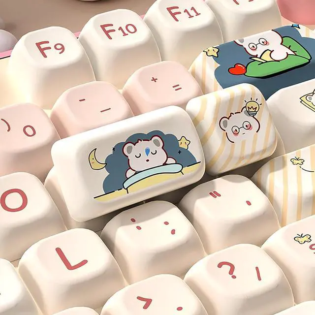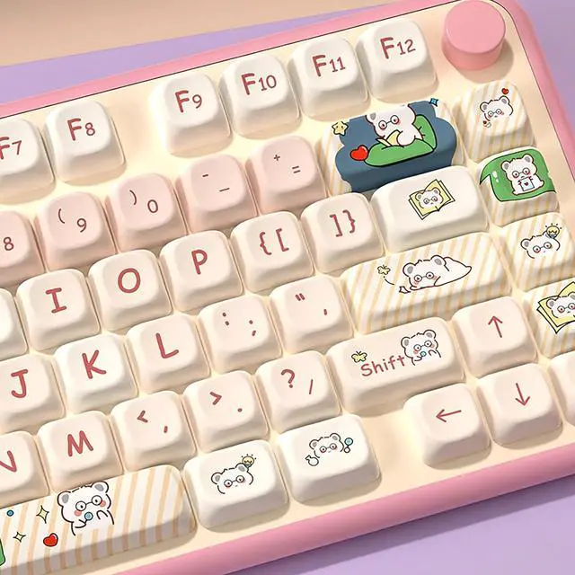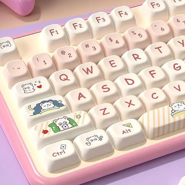 Add personality and comfort to your mechanical keyboard with these PBT keycaps. Featuring an adorable bear theme, these cute keycaps are designed with advanced dye-sublimation technology, ensuring long-lasting vibrant designs that won't fade. The ergonomic MOT profile keycaps with concave surfaces fit your fingers better, offering a comfortable typing experience. This set includes 120 keys, compatible with 61%, 75%, and 100% mechanical keyboard layouts. Perfect for home, office, or gaming, these cool round keycaps are an excellent way to refresh your keyboard and make it stand out.