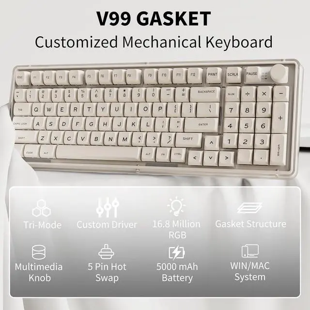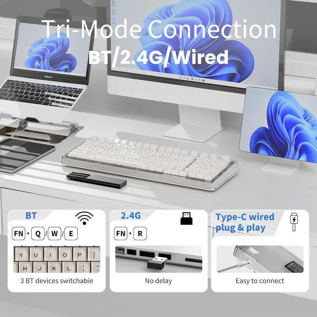 Tri-Mode Wireless Mechanical Keyboard: EWEADN V99 wireless keyboard supports Bluetooth 5.0, 2.4Ghz, and USB-C wired three modes, connecting 5 devices at the same time. Press and hold FN & Q/W/E/R key combination to switch BT1/BT2/BT3/2.4G. Wired mode is plug-and-play, start typing after connecting. Effortlessly pair with laptops, tablets, phones, and various operating systems, including Windows, Mac, and Linux. Meet you and needs of work, games, study