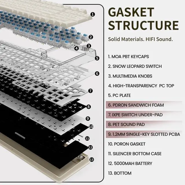 Gasket Mechanical Keyboard: The wireless bluetooth keyboard uses four-layer filling pads to reduce key noise and make the sounds thocky. Filling the gap between the PCB, positioning plate, and switch, enhances the cute keyboard's solidity and HIFI sound. The upgraded anti-vibration structure with the non-opening shrapnel provides a soft and elastic feel, ensuring consistent key positions and preventing local collapse from excessive use. This bluetooth keyboard offers great typing experience with improved sound quality and enhanced durability. Feel more solid and sound more HIFI