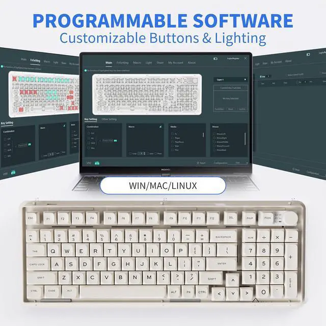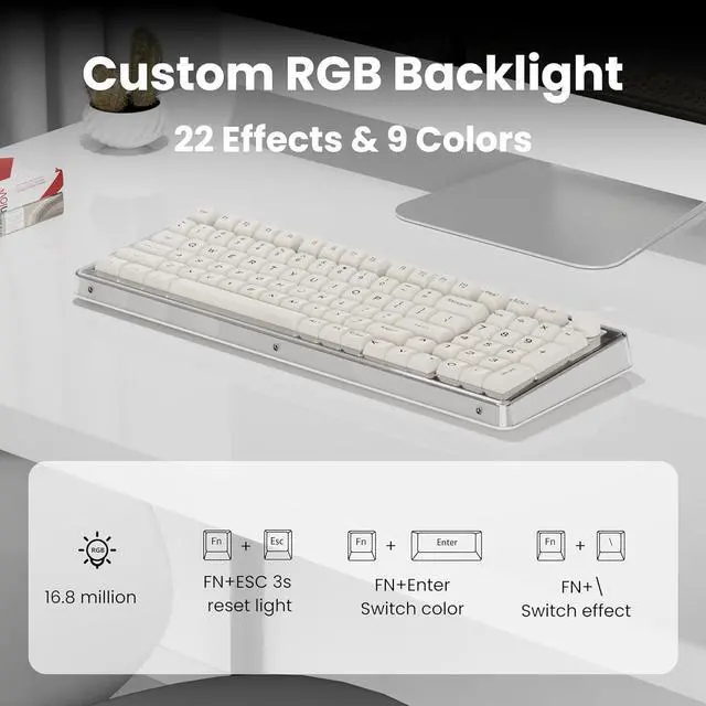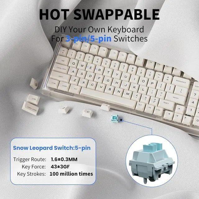Hot-swappable Custom Keyboard & Snow Leopard Switches: Wireless aesthetic keyboard is equipped with a hot-swappable PCB to ensure easy replacement of different mechanical switches with 3-pin or 5-pin without soldering issues. Change the switches and keycaps of mechanical gaming keyboard according to your preferences. Wireless gaming keyboard uses pre-lubricated transparent mechanical switches with a key life of 50 million times. It has an N-key rollover function that responds to multiple keys being pressed simultaneously, making it more suitable for using hotkeys or gaming