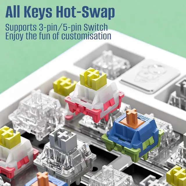 DIY Keyboard and Gasket Structure: The custom keyboard is designed with a stacked gasket structure using the best PORON material, which makes the clicky keyboard greatly reduce the cavity noise type more softer. It delivers a low-noise typing experience. The hot-swappable mechanical keyboard is compatible with 3-pin and 5-pin switches on the market. You can easily customize and change the switches to experience different keystrokes or gaming feeling