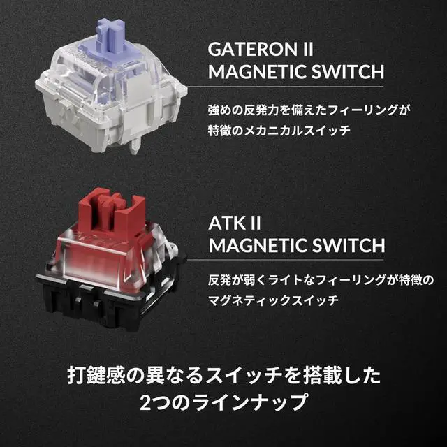 The ATK 75 and ATK 68 come in a lineup of two versions with different magnetic switches. Both switches have common basic specifications, such as the action distance adjustment and rapid trigger support, but have a different sense of attack. The "ATK II Magnetic Switch" version features a keystroke 4.0+0.3mm and a 28+10gf action force with a weak repulsion and a light feel