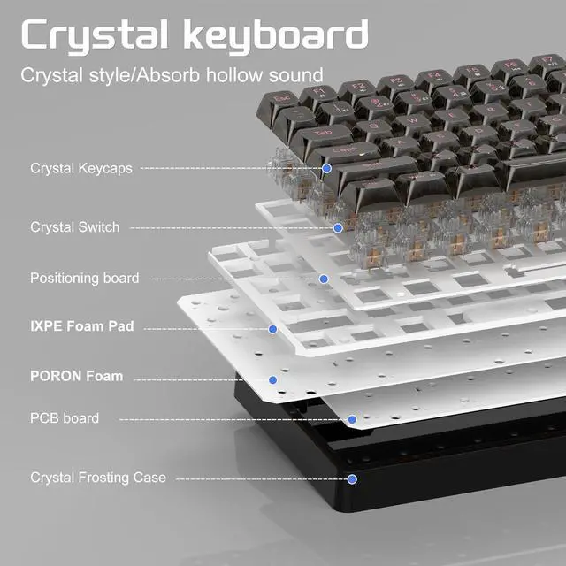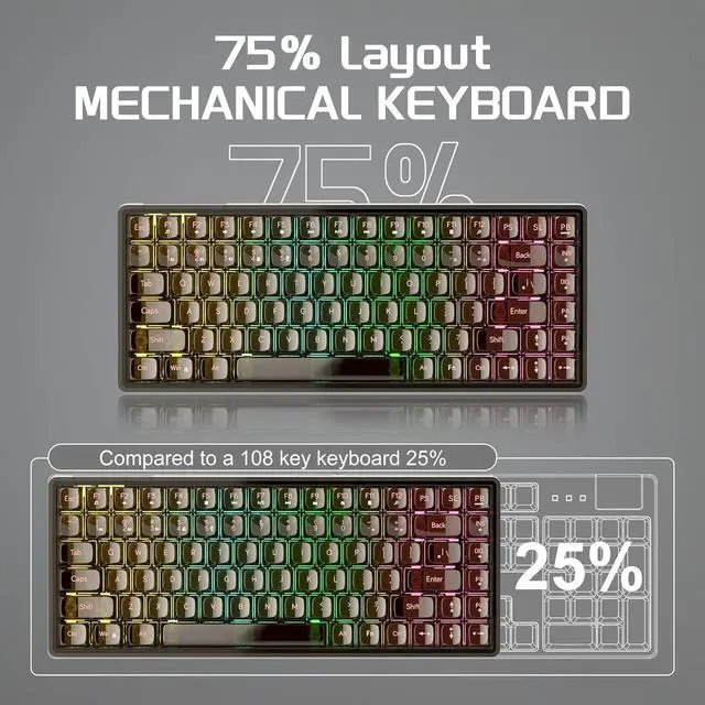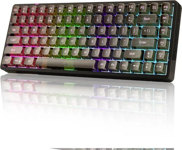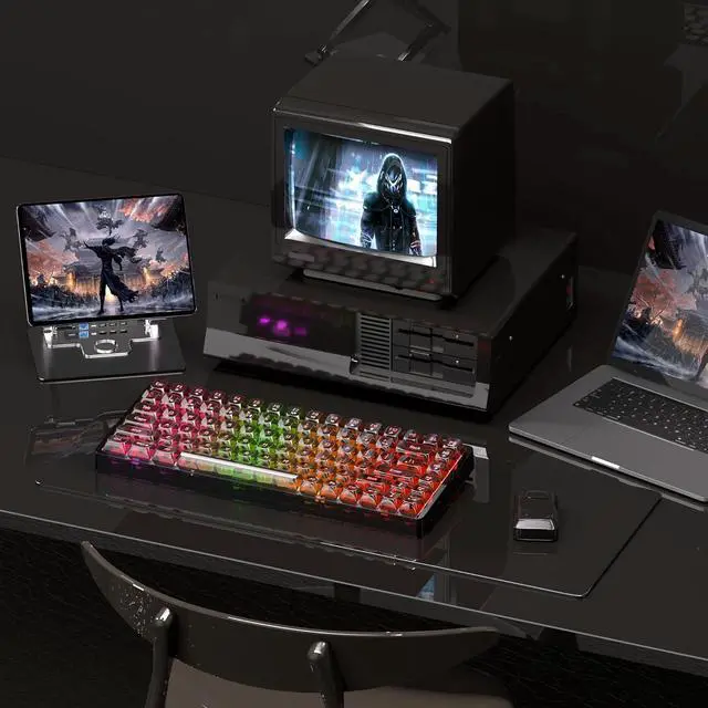 Transparent keycaps and RGB backlighting Black transparent keycaps, feel delicate and smooth, keycap characters are clear and do not lose color. RGB backlighting for all keys, cool and eye-catching, adjustable light effects, adjustable brightness, enjoy a colorful visual experience, enjoy the beauty of transparent design